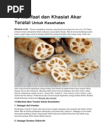 Akar teratai bermanfaat bagi kesehatan jantung, kulit, otak, dan organ lainnya. 10 gram biji teratai/lien ce dan 15 gram tunas biji teratai (lien sim). Akar teratai aman dikonsumsi dan memiliki banyak manfaat bagi kesehatan tubuh. Akar teratai ternyata bisa memberikan berbagai manfaat yang baik untuk tubuh. Isi akar teratai dengan beras ketan dan gula untuk membuat hidangan yang manis dan gurih.